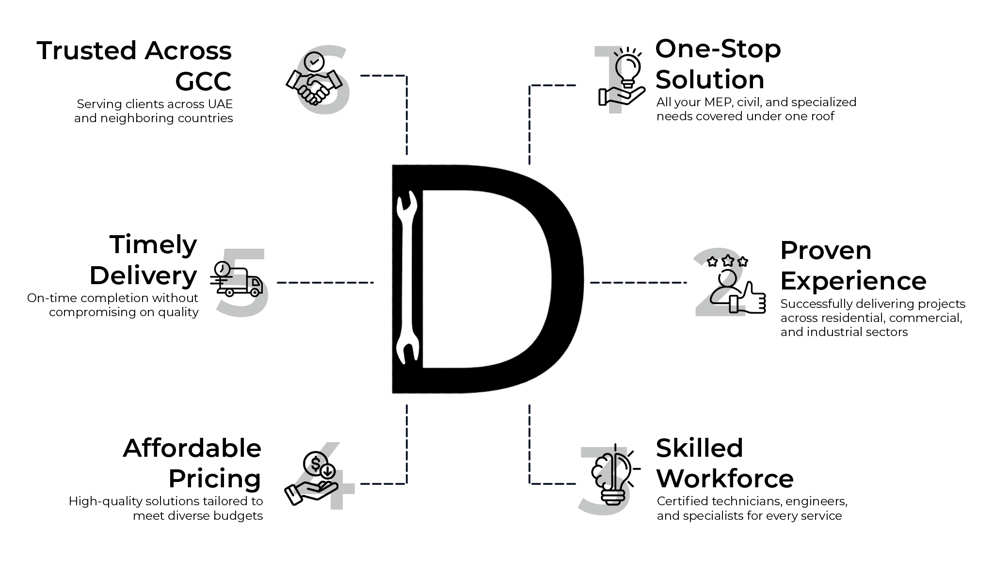 Operating across the UAE and GCC countries, our goal is simple: to provide dependable technical services that make your spaces safer, stronger, and smarter. From residential villas and offices to high-rise buildings and industrial projects, DTS brings precision, expertise, and commitment to every job.